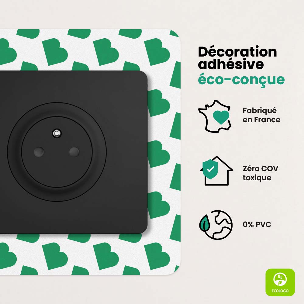 Nos décorations adhésives sont compatibles avec la plupart des prises et interrupteurs, notamment des marques Legrand ou Schneider Electric. Pour vous en assurer, retirez le cache et mesurez la largeur et la hauteur de la fixation de la prise. Si elle mesure moins de 7,8 cm, c’est tout bon !