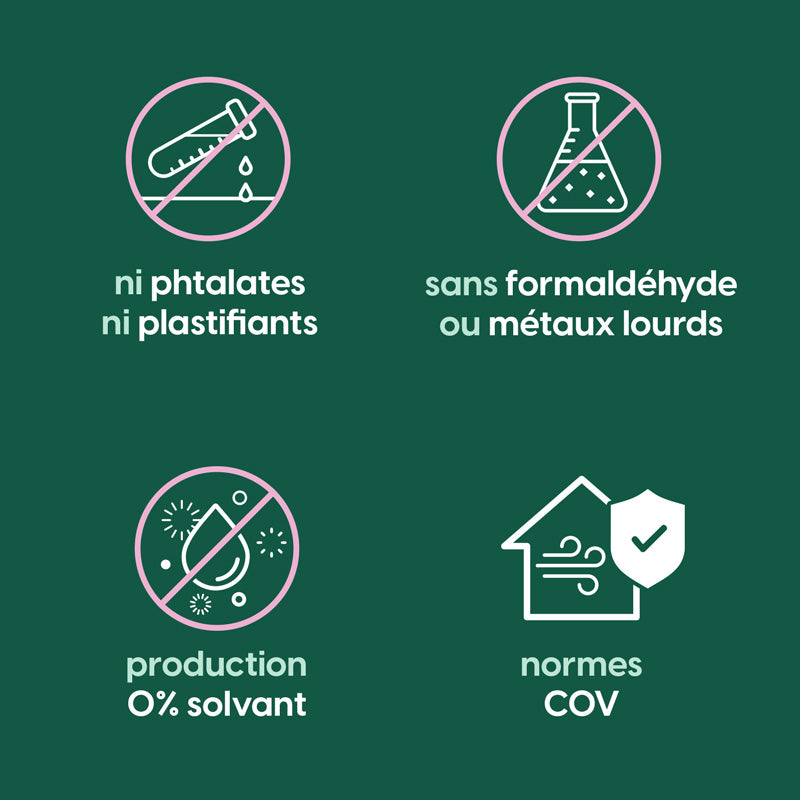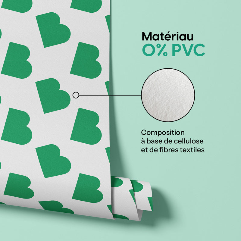 Beaucoup de papiers peints du marché contiennent du PVC aussi appelé vinyle, une matière plastique issue de la pétrochimie. Chez nous, aucun papier peint n'en contient. Nous travaillons exclusivement des supports à base d'intissés composés de cellulose et de fibres textiles, garantissant :